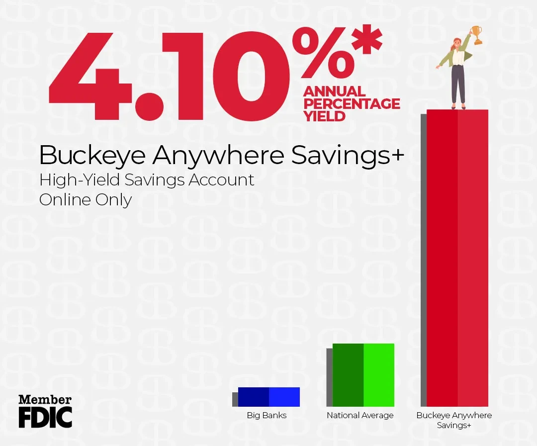 Introducing Buckeye Anywhere Savings+ — our new online-only savings account offering an impressive 4.10% APY*. Designed for savvy savers who want more from their money, this exclusive digital account combines the power of high-yield growth with the trust of your Ohio-based community bank. It's smart, secure, and only available online. Bank. Local. Save Big.